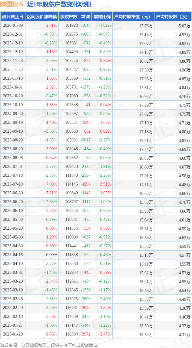 从股价来看,2025年12月31日至2026年1月9日,陕国投A区间涨幅为2.61%,在此期间股东户数减少1048.0户,减幅为1.02%。