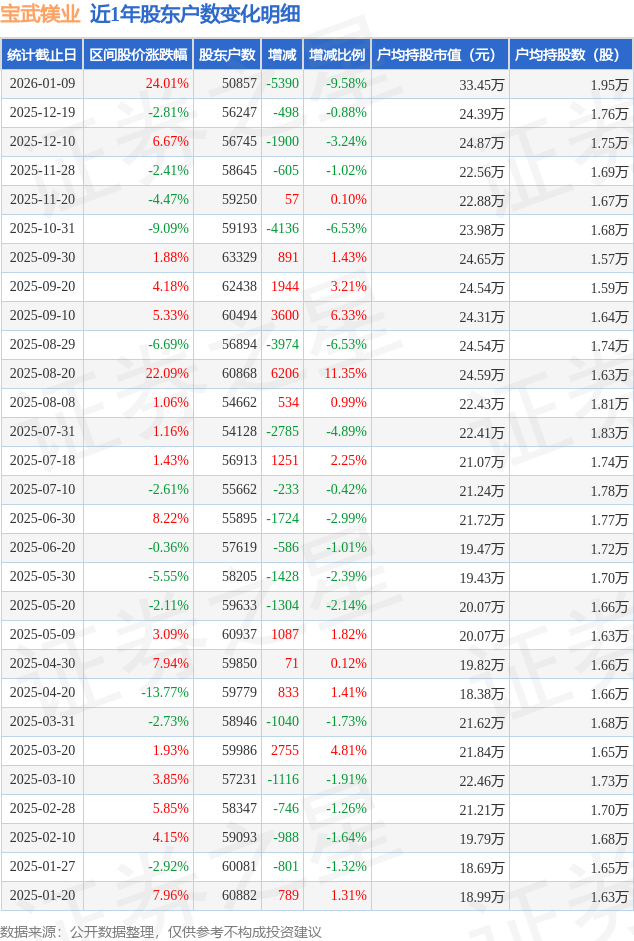 从股价来看,2025年12月19日至2026年1月9日,宝武镁业区间涨幅为24.01%,在此期间股东户数减少5390.0户,减幅为9.58%。