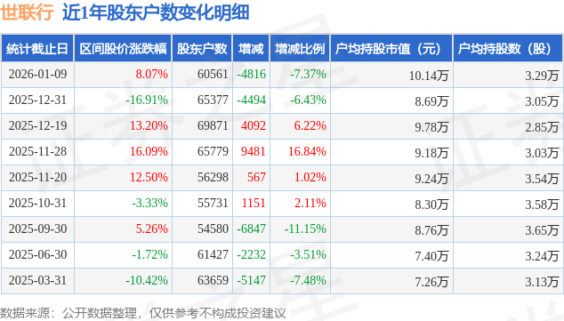 从股价来看,2025年12月31日至2026年1月9日,世联行区间涨幅为8.07%,在此期间股东户数减少4816.0户,减幅为7.37%。