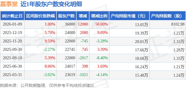 证券之星消息,近日嘉事堂披露,截至2026年1月9日公司股东户数为3.6万户,较12月19日增加1.2万户,增幅为50.0%。户均持股数量由上期的1.22万股减少至8103.0股,户均持股市值为13.05万元。