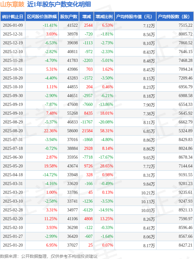 从股价来看,2025年12月31日至2026年1月9日,山东章鼓区间跌幅为11.41%,在此期间股东户数增加2544.0户,增幅为6.53%。
