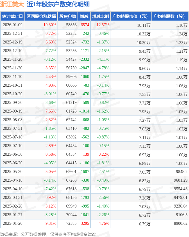 从股价来看,2025年12月31日至2026年1月9日,浙江美大区间涨幅为10.3%,在此期间股东户数增加6574.0户,增幅为12.57%。