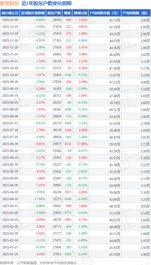 从股价来看,2025年12月19日至2026年1月9日,新宝股份区间跌幅为0.69%,在此期间股东户数增加669.0户,增幅为2.42%。