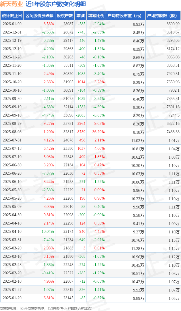 从股价来看,2025年12月31日至2026年1月9日,新天药业区间涨幅为3.53%,在此期间股东户数减少585.0户,减幅为2.04%。