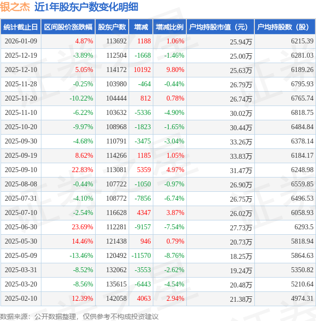 从股价来看,2025年12月19日至2026年1月9日,银之杰区间涨幅为4.87%,在此期间股东户数增加1188.0户,增幅为1.06%。