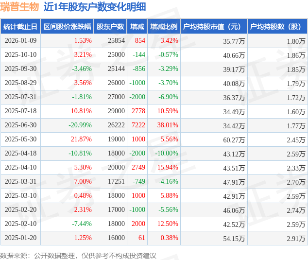 从股价来看,2025年12月19日至2026年1月9日,瑞普生物区间涨幅为1.53%,在此期间股东户数增加854.0户,增幅为3.42%。
