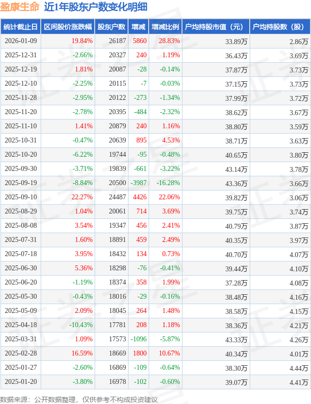 从股价来看,2025年12月31日至2026年1月9日,盈康生命区间涨幅为19.84%,在此期间股东户数增加5860.0户,增幅为28.83%。