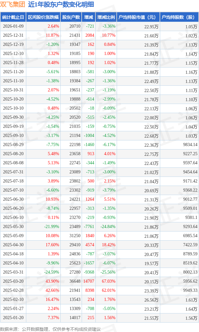 从股价来看,2025年12月31日至2026年1月9日,双飞集团区间涨幅为2.64%,在此期间股东户数减少721.0户,减幅为3.36%。