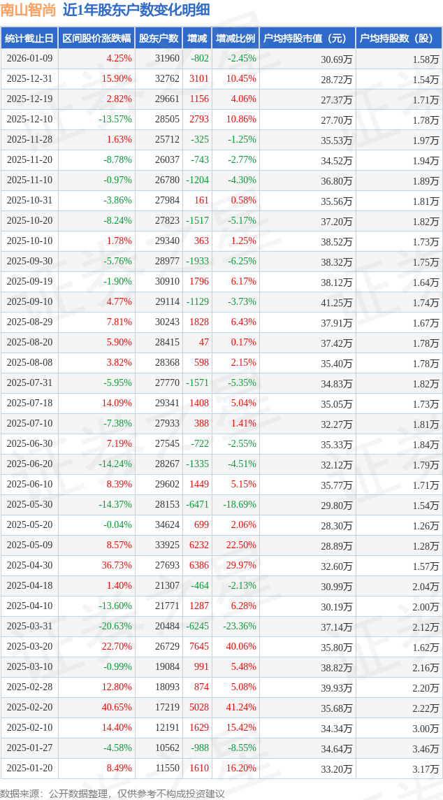从股价来看,2025年12月31日至2026年1月9日,南山智尚区间涨幅为4.25%,在此期间股东户数减少802.0户,减幅为2.45%。