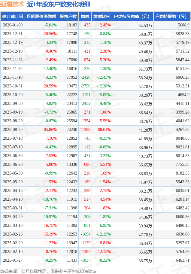 从股价来看,2025年12月31日至2026年1月9日,强瑞技术区间跌幅为5.01%,在此期间股东户数增加435.0户,增幅为2.45%。