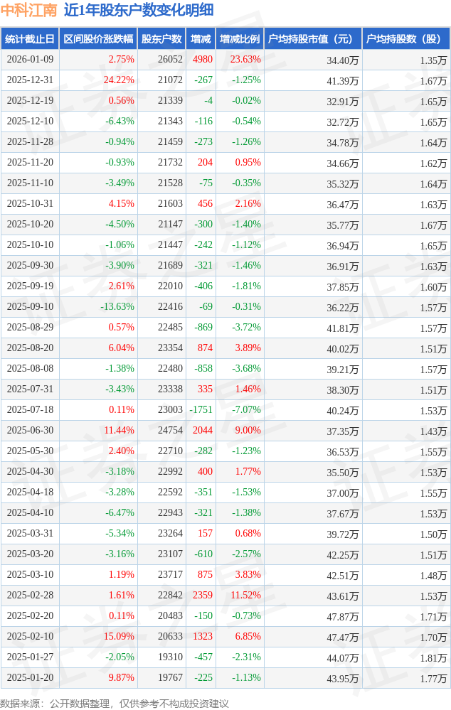 证券之星消息,近日中科江南披露,截至2026年1月9日公司股东户数为2.61万户,较12月31日增加4980.0户,增幅为23.63%。户均持股数量由上期的1.67万股减少至1.35万股,户均持股市值为34.4万元。