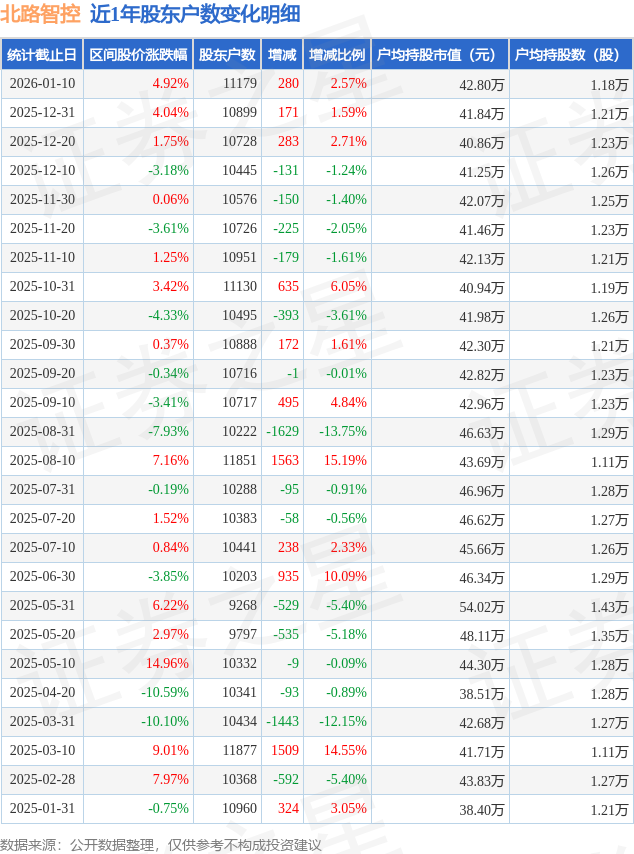 从股价来看,2025年12月31日至2026年1月10日,北路智控区间涨幅为4.92%,在此期间股东户数增加280.0户,增幅为2.57%。