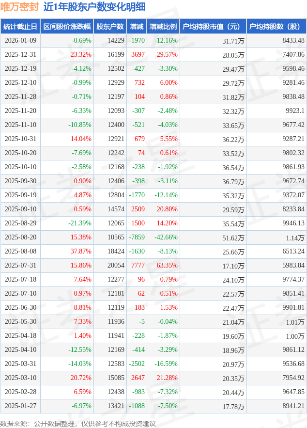 从股价来看,2025年12月31日至2026年1月9日,唯万密封区间跌幅为0.69%,在此期间股东户数减少1970.0户,减幅为12.16%。