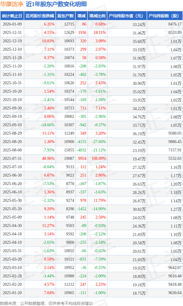 从股价来看,2025年12月31日至2026年1月9日,华康洁净区间涨幅为6.35%,在此期间股东户数增加86.0户,增幅为0.68%。