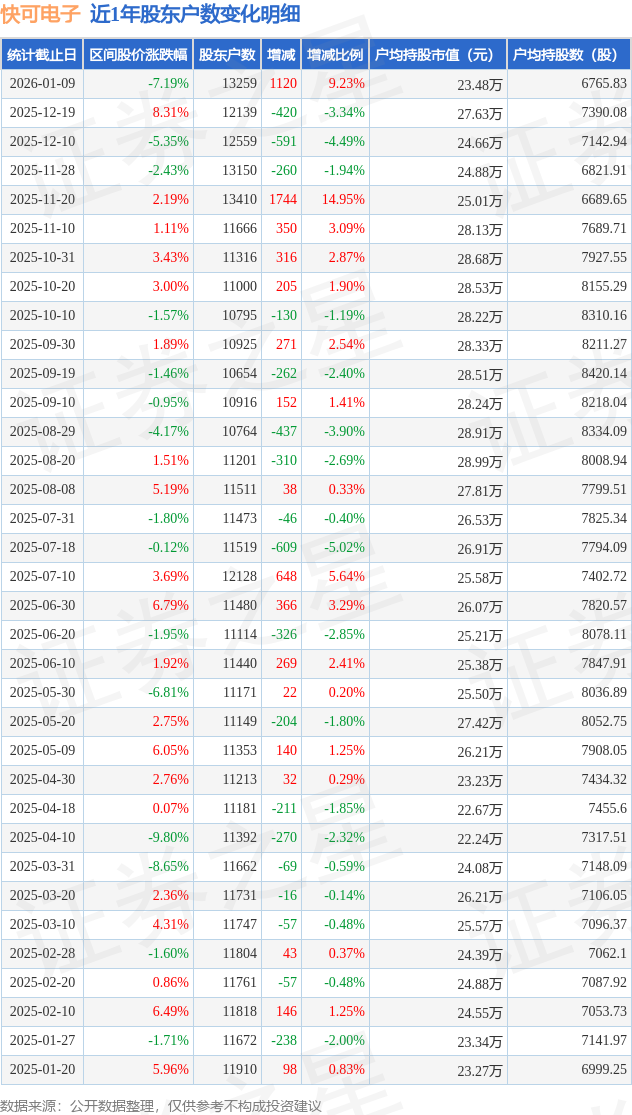 从股价来看,2025年12月19日至2026年1月9日,快可电子区间跌幅为7.19%,在此期间股东户数增加1120.0户,增幅为9.23%。