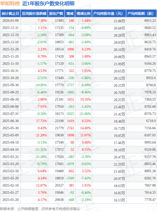 从股价来看,2025年12月31日至2026年1月9日,华如科技区间涨幅为7.3%,在此期间股东户数增加248.0户,增幅为1.44%。