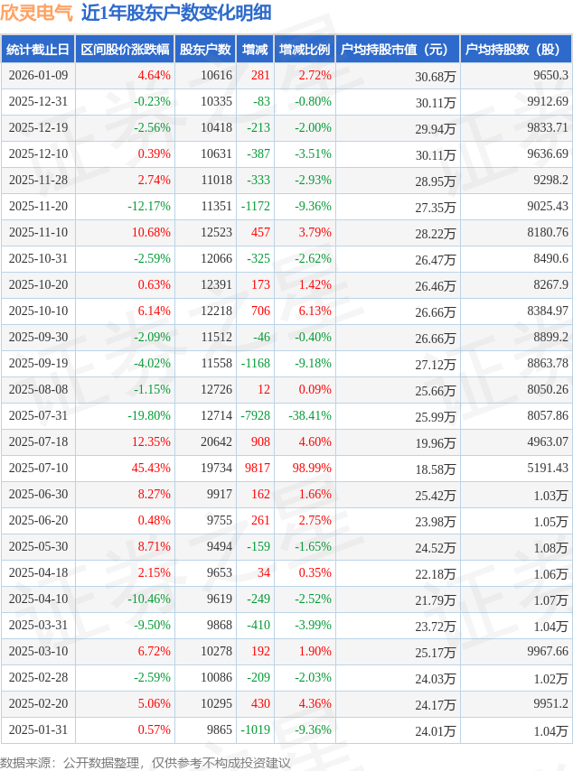 从股价来看,2025年12月31日至2026年1月9日,欣灵电气区间涨幅为4.64%,在此期间股东户数增加281.0户,增幅为2.72%。