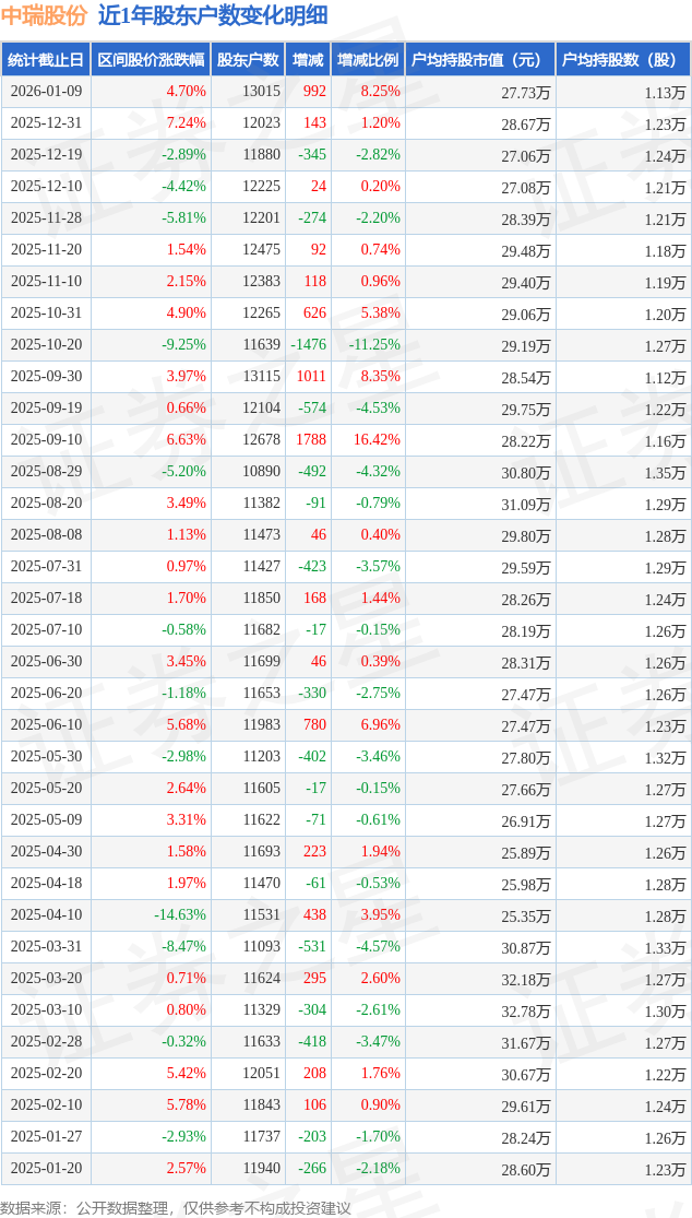 从股价来看,2025年12月31日至2026年1月9日,中瑞股份区间涨幅为4.7%,在此期间股东户数增加992.0户,增幅为8.25%。