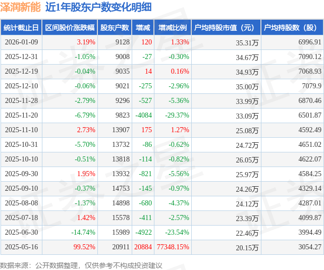 证券之星消息,近日泽润新能披露,截至2026年1月9日公司股东户数为9128.0户,较12月31日增加120.0户,增幅为1.33%。户均持股数量由上期的7090.0股减少至6997.0股,户均持股市值为35.31万元。