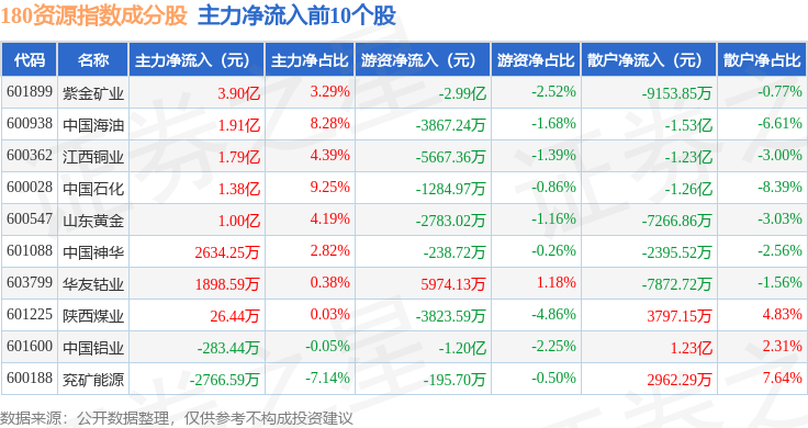 资金流向方面,180资源(000026)指数成份股当日主力资金净流出合计2978.79万元,游资资金净流出合计9430.7万元,散户资金净流入合计1.24亿元。成份股资金流向详情见下表: