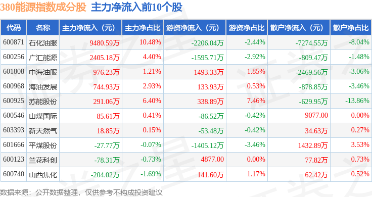 资金流向方面,380能源(000104)指数成份股当日主力资金净流出合计6031.95万元,游资资金净流入合计2015.85万元,散户资金净流入合计4016.1万元。成份股资金流向详情见下表: