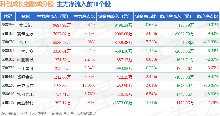 资金流向方面,科创成长(000690)指数成份股当日主力资金净流出合计36.69亿元,游资资金净流入合计28.98亿元,散户资金净流入合计7.71亿元。成份股资金流向详情见下表: