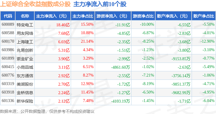 资金流向方面,上证综合全收益(000888)指数成份股当日主力资金净流出合计683.89亿元,游资资金净流入合计165.96亿元,散户资金净流入合计517.93亿元。成份股资金流向详情见下表: