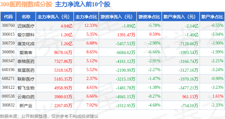 资金流向方面,300医药(000913)指数成份股当日主力资金净流入合计5.4亿元,游资资金净流出合计2.92亿元,散户资金净流出合计2.49亿元。成份股资金流向详情见下表: