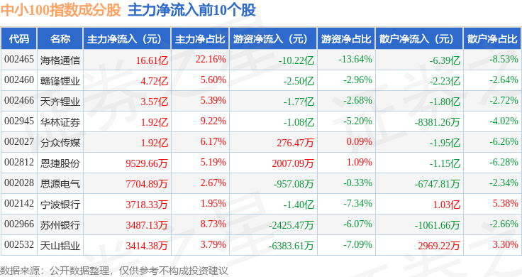 资金流向方面,中小100(399005)指数成份股当日主力资金净流出合计153.06亿元,游资资金净流入合计23.32亿元,散户资金净流入合计129.74亿元。成份股资金流向详情见下表: