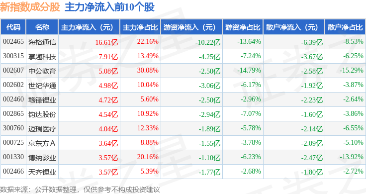 资金流向方面,新指数(399100)成份股当日主力资金净流出合计1103.19亿元,游资资金净流入合计182.18亿元,散户资金净流入合计921.02亿元。成份股资金流向详情见下表: