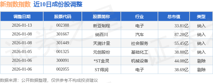 近10日内新指数(399100)成份股做了调整,新纳入了4只股票,剔除了2只股票。