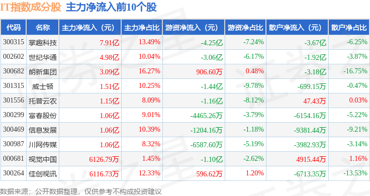 资金流向方面,IT指数(399239)成份股当日主力资金净流出合计216.86亿元,游资资金净流入合计36.07亿元,散户资金净流入合计180.79亿元。成份股资金流向详情见下表: