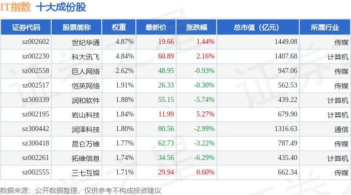 证券之星消息,1月13日,IT指数(399239)报收于2401.61点,跌1.47%,成交3639.43亿元,换手率11.71%。当日该指数成份股中,上涨的有51家,通达海以19.99%的涨幅领涨,下跌的有193家,观想科技以10.3%的跌幅领跌。