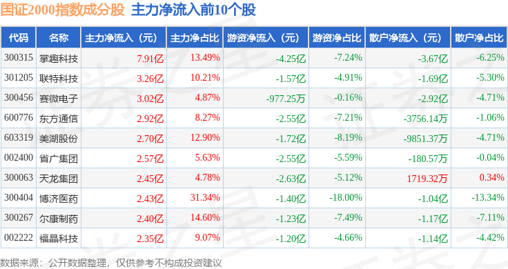 资金流向方面,国证2000(399303)指数成份股当日主力资金净流出合计600.5亿元,游资资金净流入合计77.48亿元,散户资金净流入合计519.39亿元。成份股资金流向详情见下表: