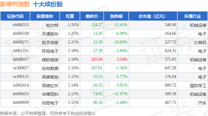 新硬件(399360)指数十大成份股详情如下: