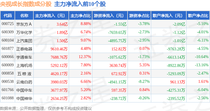资金流向方面,央视成长(399552)指数成份股当日主力资金净流出合计55.37亿元,游资资金净流入合计16.79亿元,散户资金净流入合计38.58亿元。成份股资金流向详情见下表: