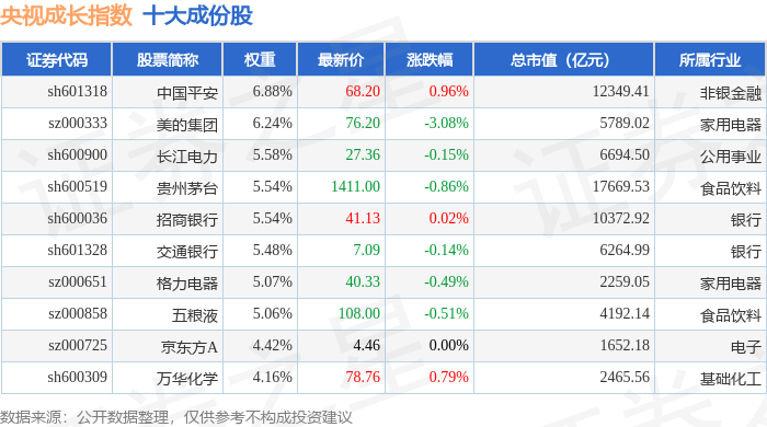 央视成长(399552)指数十大成份股详情如下: