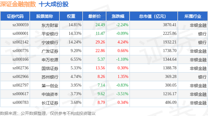 资金流向方面,深证金融(399619)指数成份股当日主力资金净流出合计10.71亿元,游资资金净流出合计1.43亿元,散户资金净流入合计12.14亿元。成份股资金流向详情见下表:
