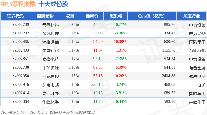 中小等权(399634)指数十大成份股详情如下: