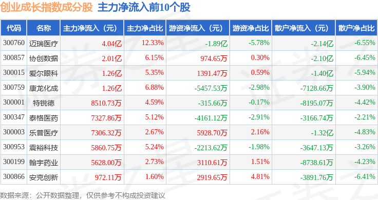 资金流向方面,创业成长(399667)指数成份股当日主力资金净流出合计175.31亿元,游资资金净流入合计56.89亿元,散户资金净流入合计118.41亿元。成份股资金流向详情见下表: