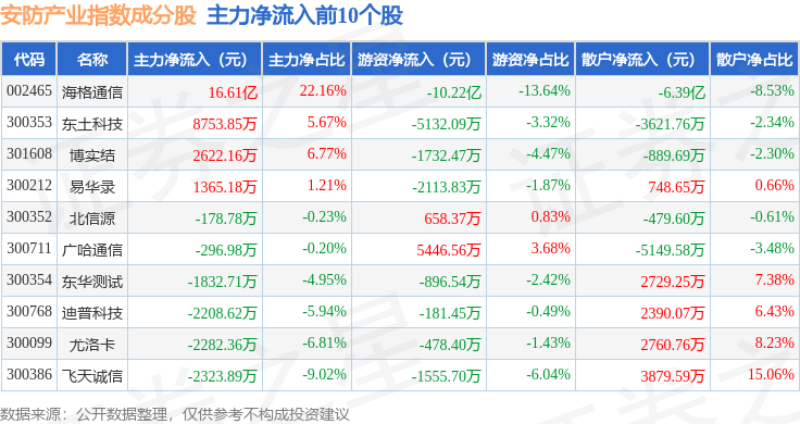 资金流向方面,安防产业(399693)指数成份股当日主力资金净流出合计74.41亿元,游资资金净流入合计7.08亿元,散户资金净流入合计67.32亿元。成份股资金流向详情见下表: