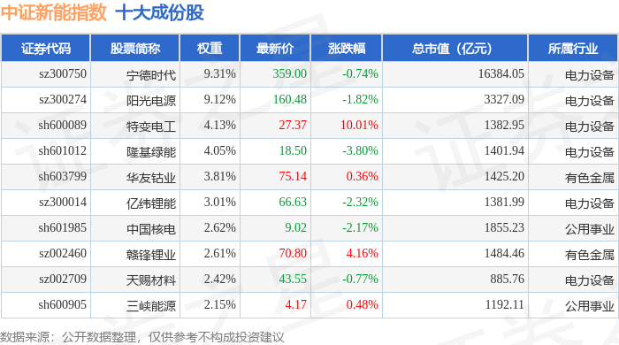 证券之星消息,1月13日,中证新能(399808)指数报收于2964.79点,跌0.5%,成交1927.74亿元,换手率2.73%。当日该指数成份股中,上涨的有23家,特变电工以10.01%的涨幅领涨,下跌的有55家,科华数据以6.96%的跌幅领跌。