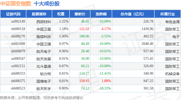 证券之星消息,1月13日,中证国安(399813)指数报收于9197.47点,跌5.08%,成交3528.35亿元,换手率7.28%。当日该指数成份股中,上涨的有13家,海格通信以10.0%的涨幅领涨,下跌的有138家,航天环宇以18.33%的跌幅领跌。