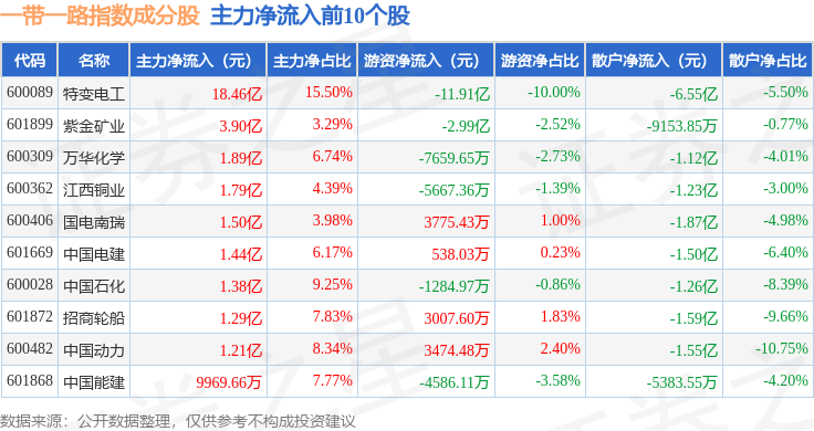 资金流向方面,一带一路(399991)指数成份股当日主力资金净流出合计88.02亿元,游资资金净流入合计18.76亿元,散户资金净流入合计69.25亿元。成份股资金流向详情见下表: