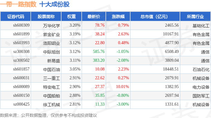 一带一路(399991)指数十大成份股详情如下: