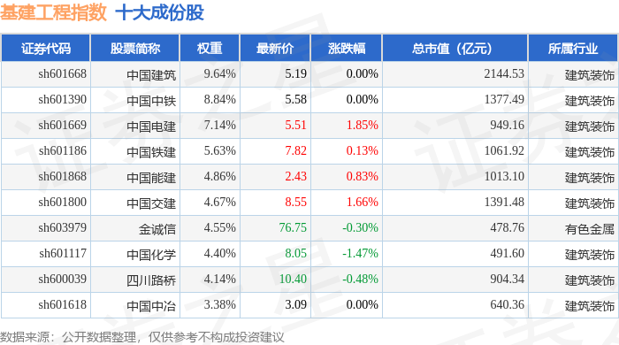 资金流向方面,基建工程(399995)指数成份股当日主力资金净流出合计6.26亿元,游资资金净流出合计2.64亿元,散户资金净流入合计8.9亿元。成份股资金流向详情见下表: