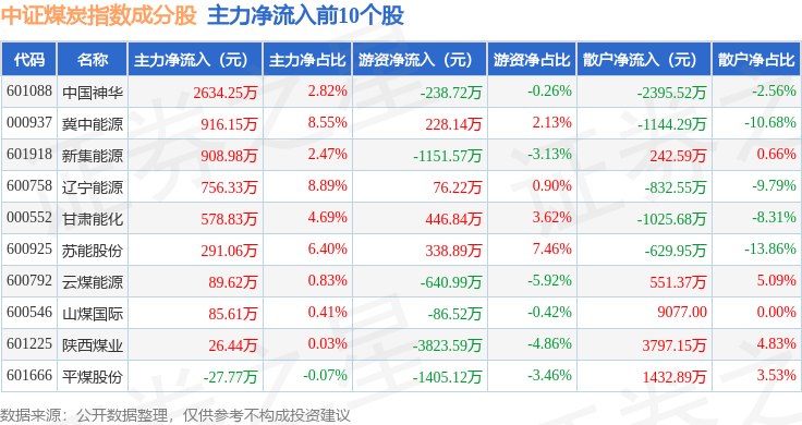 资金流向方面,中证煤炭(399998)指数成份股当日主力资金净流出合计3.72亿元,游资资金净流入合计4560.06万元,散户资金净流入合计3.26亿元。成份股资金流向详情见下表: