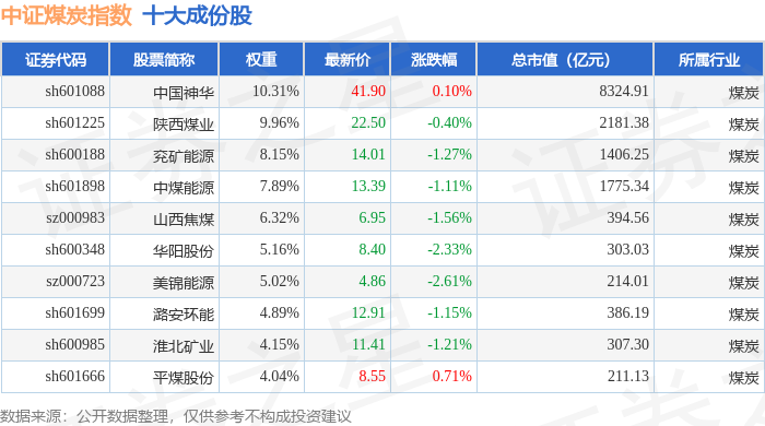 证券之星消息,1月13日,中证煤炭(399998)指数报收于2078.46点,跌0.99%,成交82.33亿元,换手率1.0%。当日该指数成份股中,上涨的有4家,新集能源以1.0%的涨幅领涨,下跌的有26家,大有能源以5.01%的跌幅领跌。