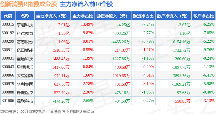 资金流向方面,创新消费R(470041)指数成份股当日主力资金净流出合计81.1亿元,游资资金净流入合计25.73亿元,散户资金净流入合计55.37亿元。成份股资金流向详情见下表: