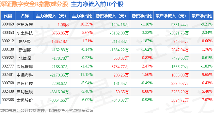 资金流向方面,深证数字安全R(470052)指数成份股当日主力资金净流出合计77.47亿元,游资资金净流入合计11.73亿元,散户资金净流入合计65.74亿元。成份股资金流向详情见下表: